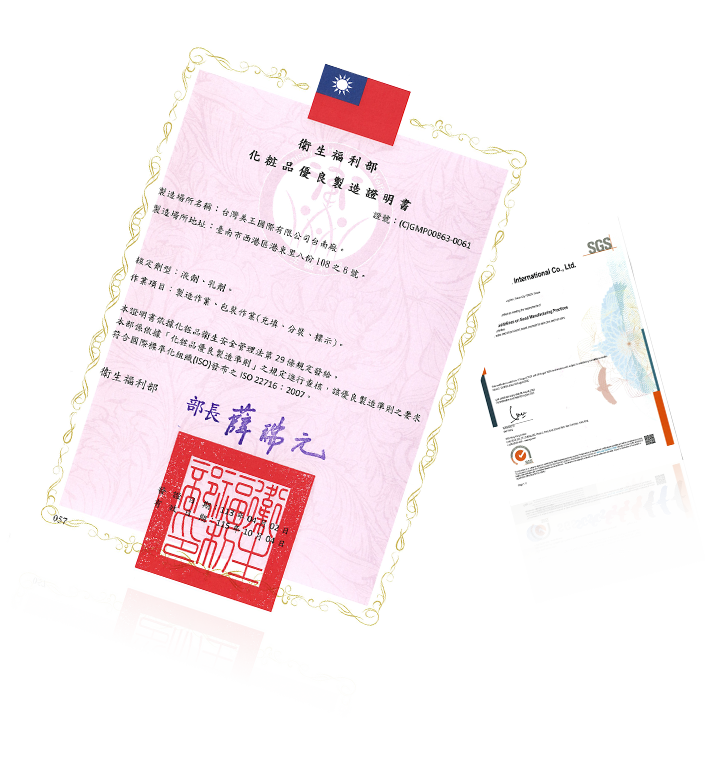 We have obtained GMP and ISO 22716 certifications to ensure the highest standards of product safety. All raw materials have been inspected and the spirit of the product traceability system has been implemented, so that consumers can have the most reliable and good quality.